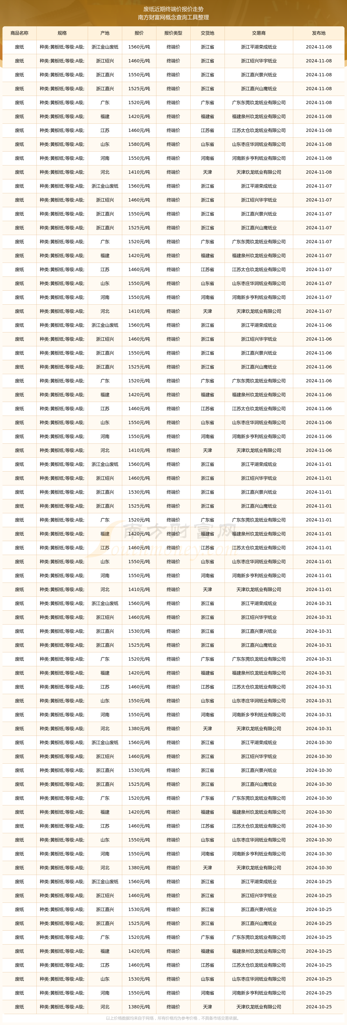 2024年11月8日,浙江平湖荣成纸业废纸(种类:黄板纸;等级:A级;),浙江金山废纸,交易地点为浙江省,终端价报价为1560.00元/吨。