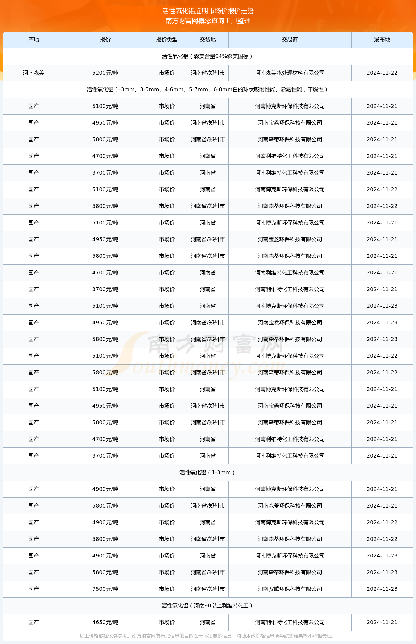2024年11月23日活性氧化铝市场价报价动态