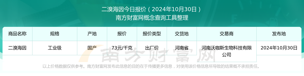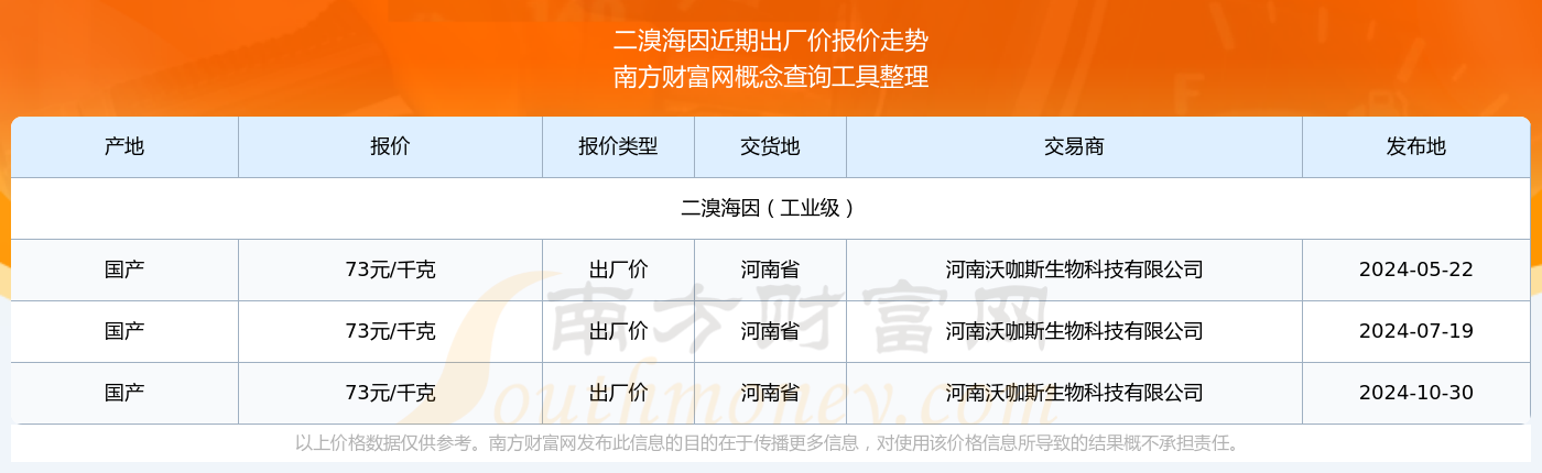 2024年10月30日,二溴海因(工业级)出厂价价格为73.00元/千克,报价人:河南沃咖斯生物科技有限公司,交易地点为河南省。
