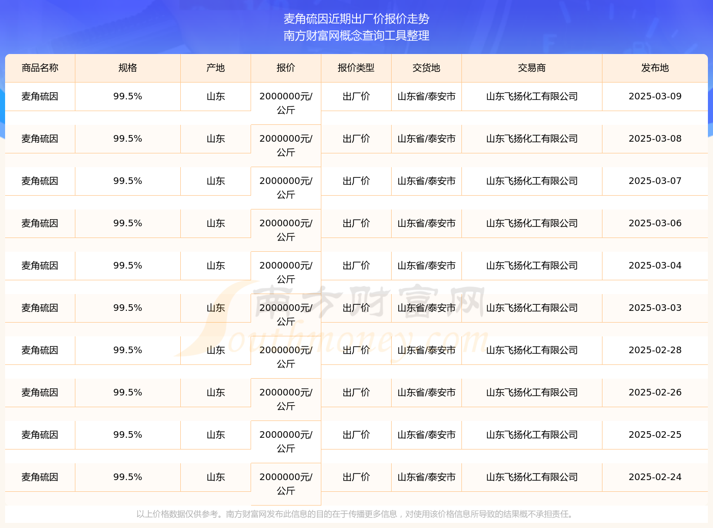 2025年3月9日,麦角硫因(99.5%)出厂价价格为2000000.00元/公斤,报价人:山东飞扬化工有限公司,交易地点为山东省/泰安市。