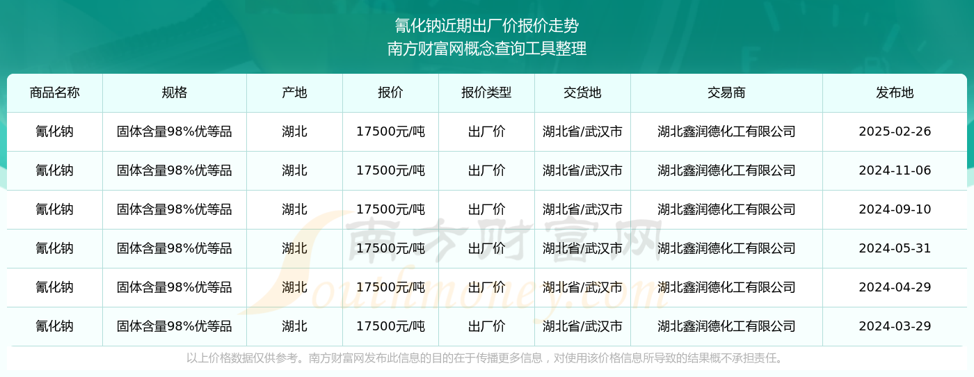 2025年2月26日,湖北鑫润德化工有限公司氰化钠(固体含量98%优等品),湖北,交易地点为湖北省/武汉市,出厂价报价为17500.00元/吨。