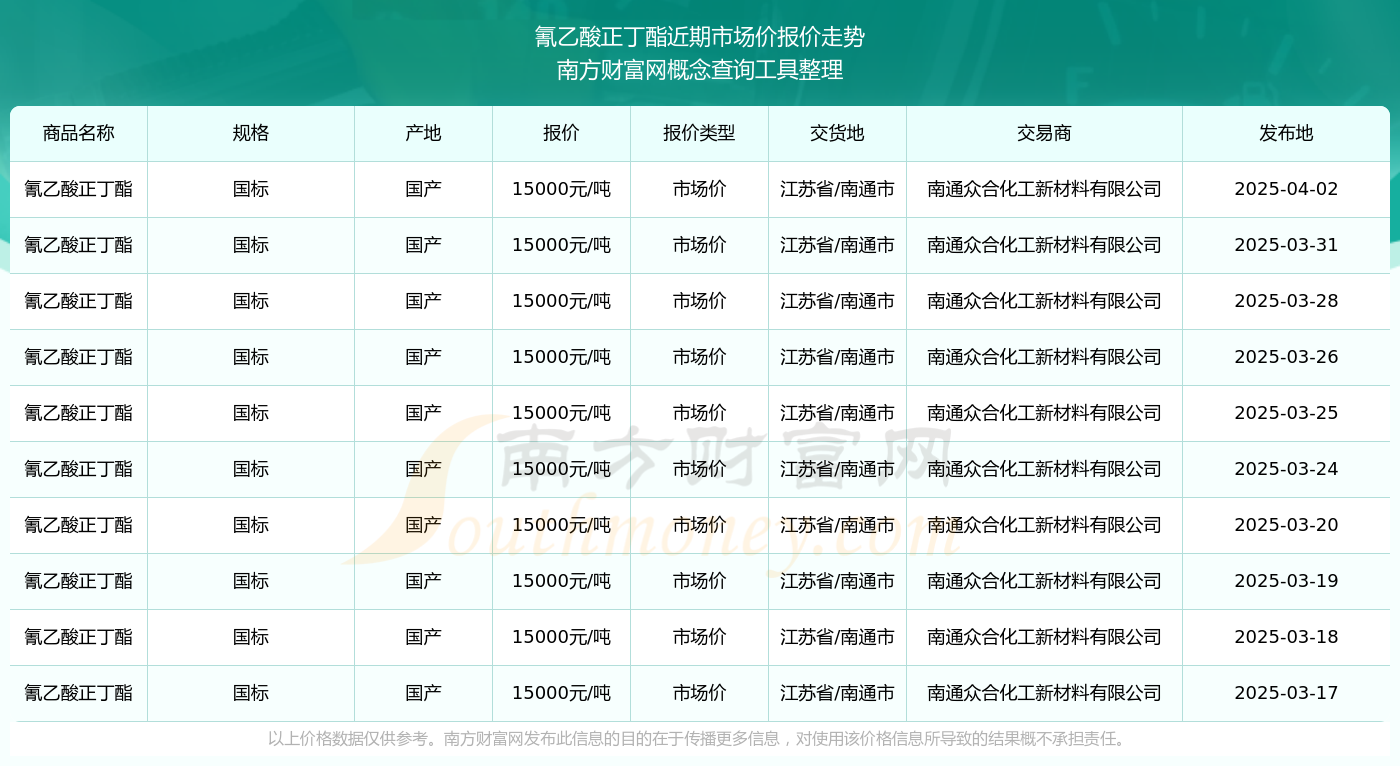 2025年4月2日,南通众合化工新材料有限公司氰乙酸正丁酯(国标),国产,交易地点为江苏省/南通市,市场价报价为15000.00元/吨。