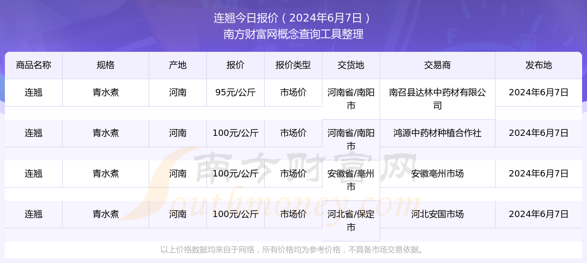 2024年6月7日,连翘(青水煮)市场价价格为100.00元/公斤,报价人:鸿源中药材种植合作社,交易地点为河南省/南阳市。
