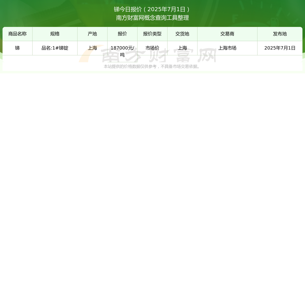 2025年7月1日,锑(品名:1#锑锭)市场价价格为187000.00元/吨,报价人:上海市场,交易地点为上海。