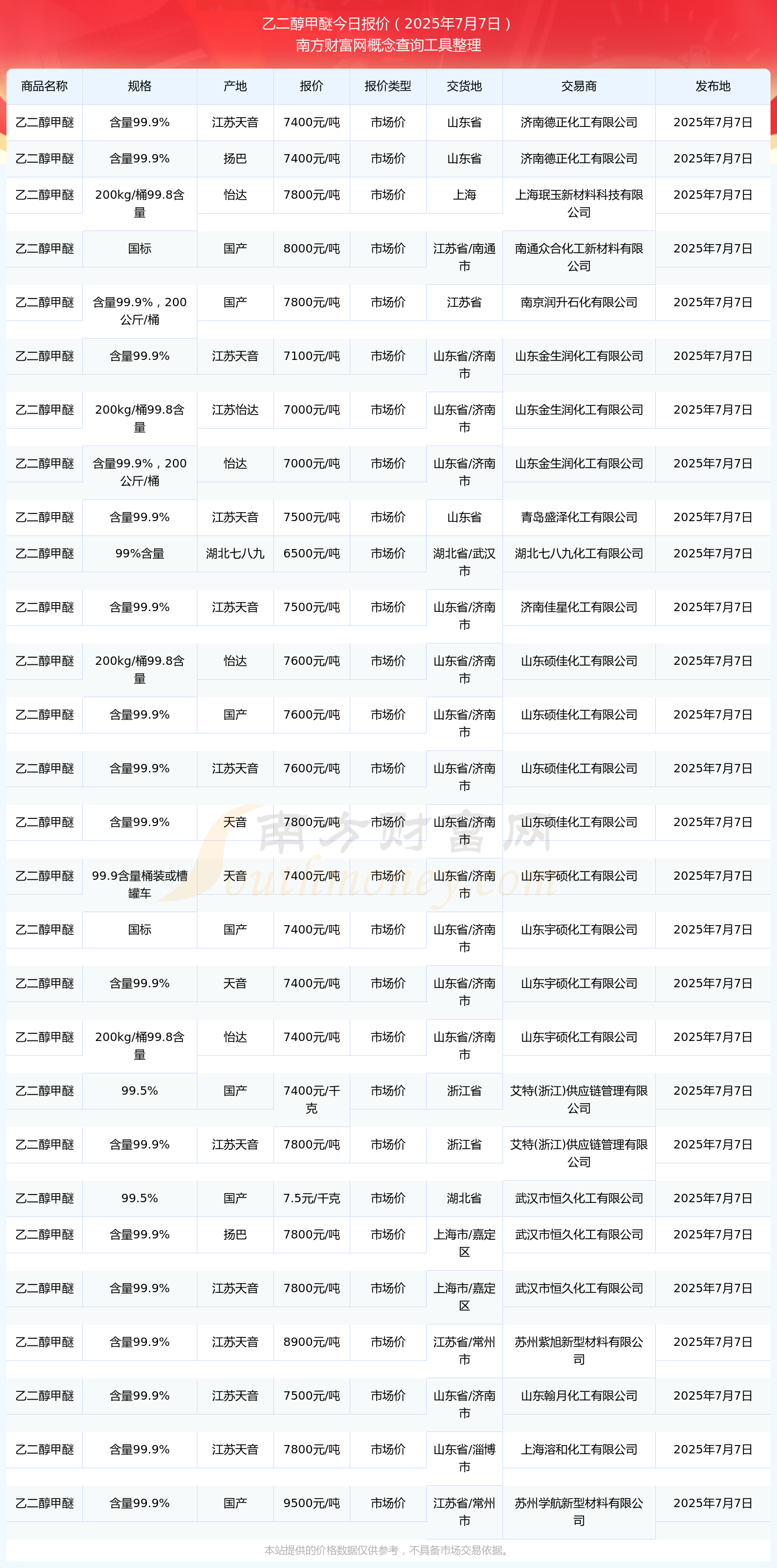 2025年7月7日,上海珉玉新材料科技有限公司乙二醇甲醚(200kg/桶99.8含量),怡达,交易地点为上海,市场价报价为7800.00元/吨。