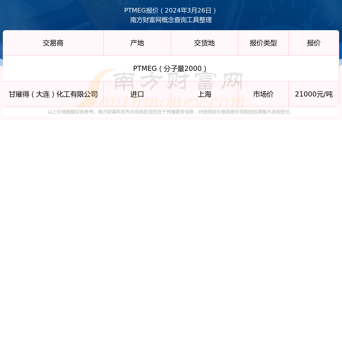 2024年3月26日,甘璀得(大连)化工有限公司PTMEG(分子量2000),进口,交易地点为上海,报价为21000.00元/吨。