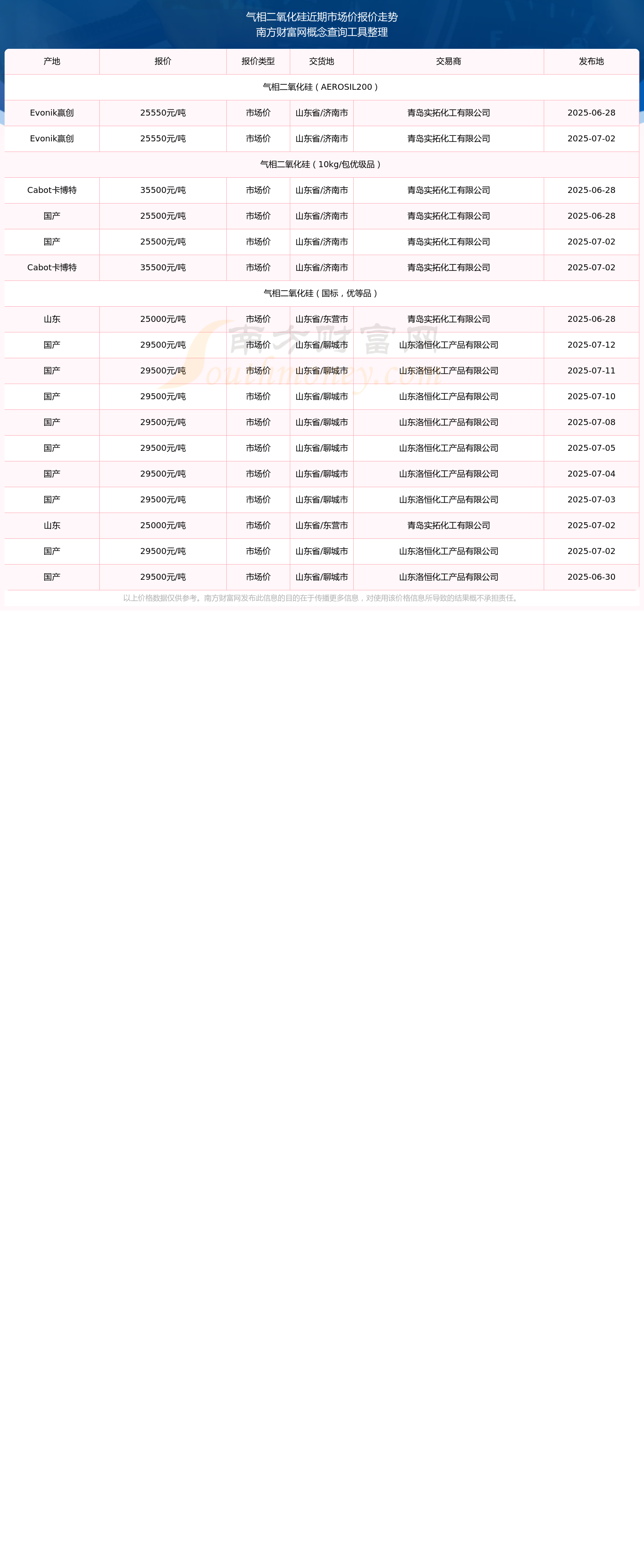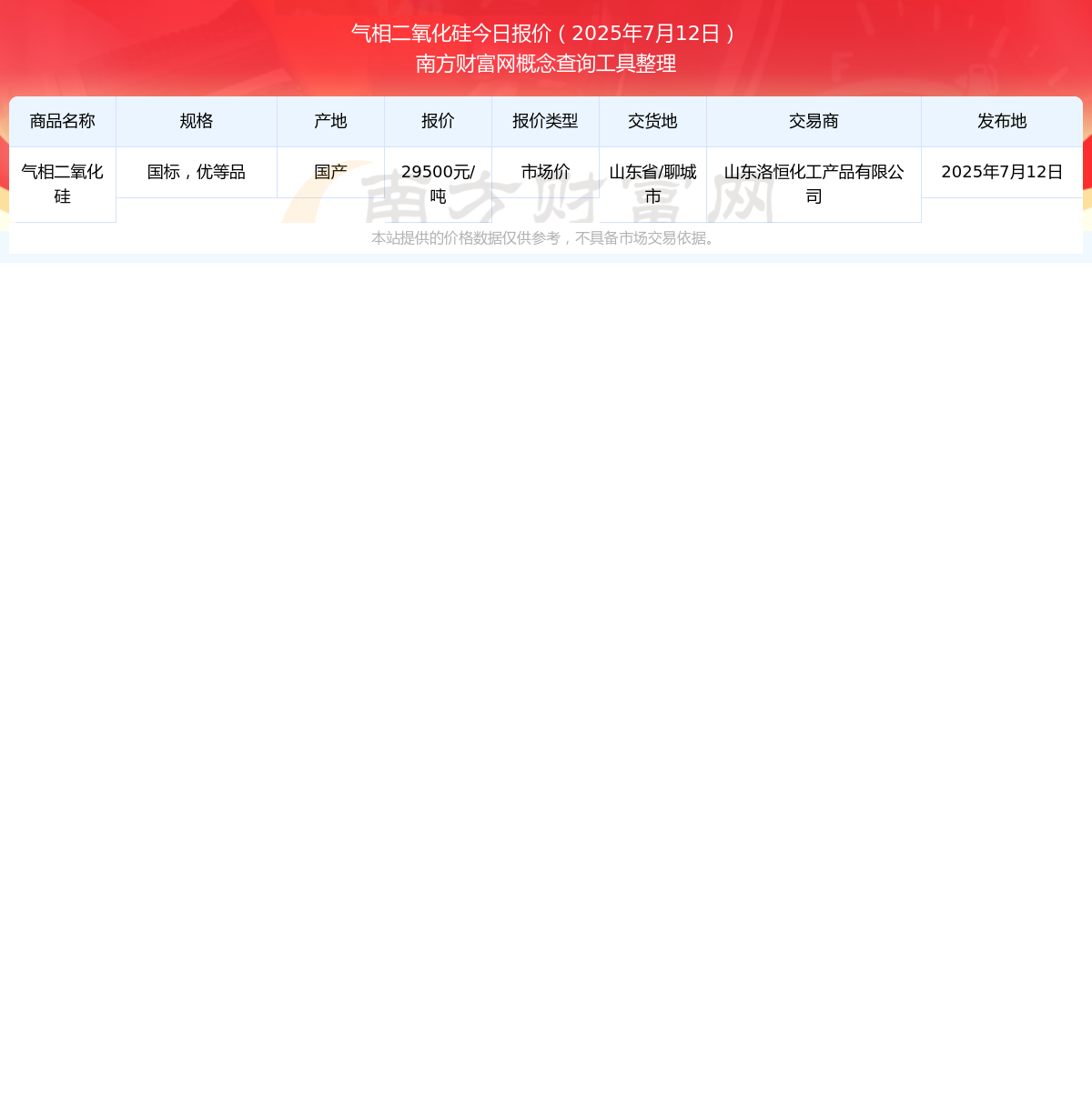 2025年7月12日,山东洛恒化工产品有限公司气相二氧化硅(国标,优等品),国产,交易地点为山东省/聊城市,市场价报价为29500.00元/吨。