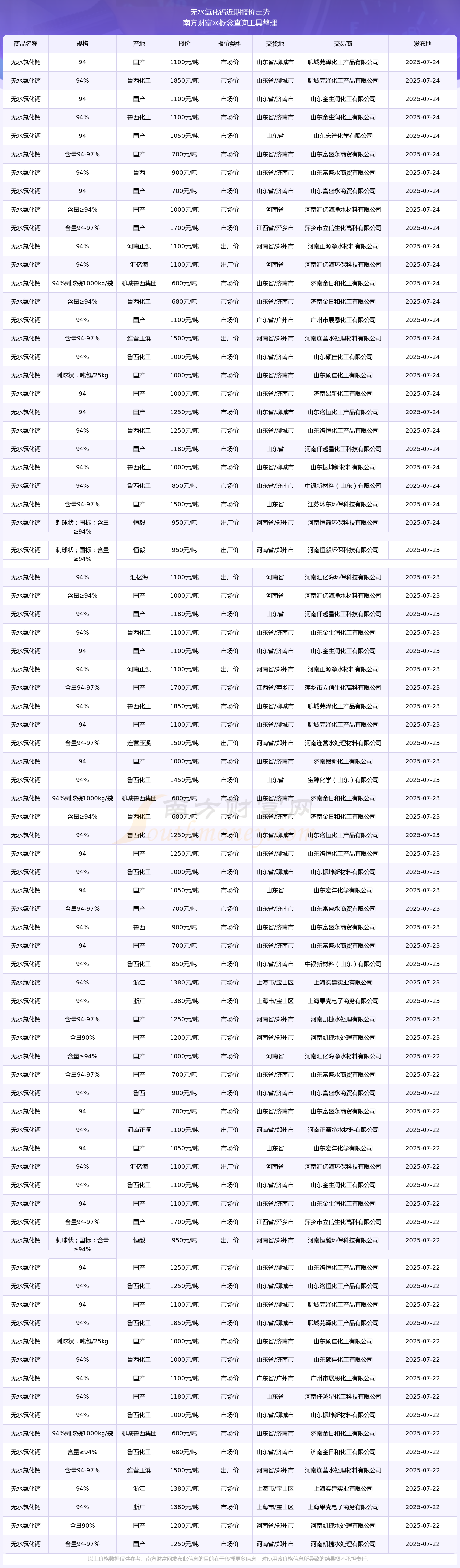 2025年7月24日,河南恒毅环保科技有限公司无水氯化钙(刺球状;国标;含量≥94%),恒毅,交易地点为河南省/郑州市,报价为950.00元/吨。