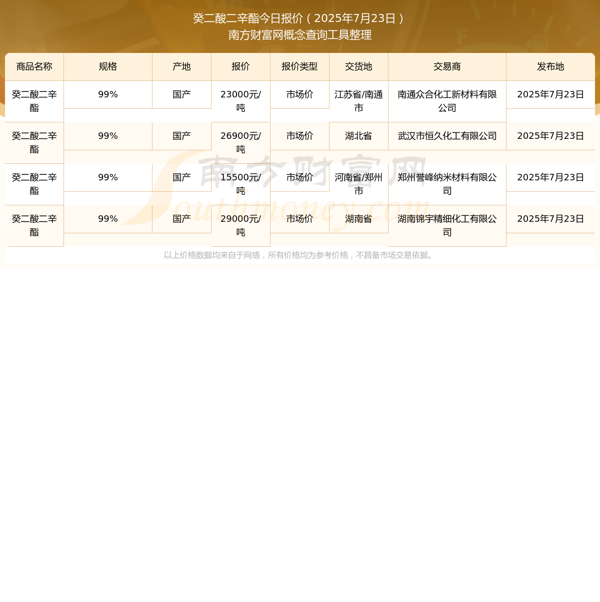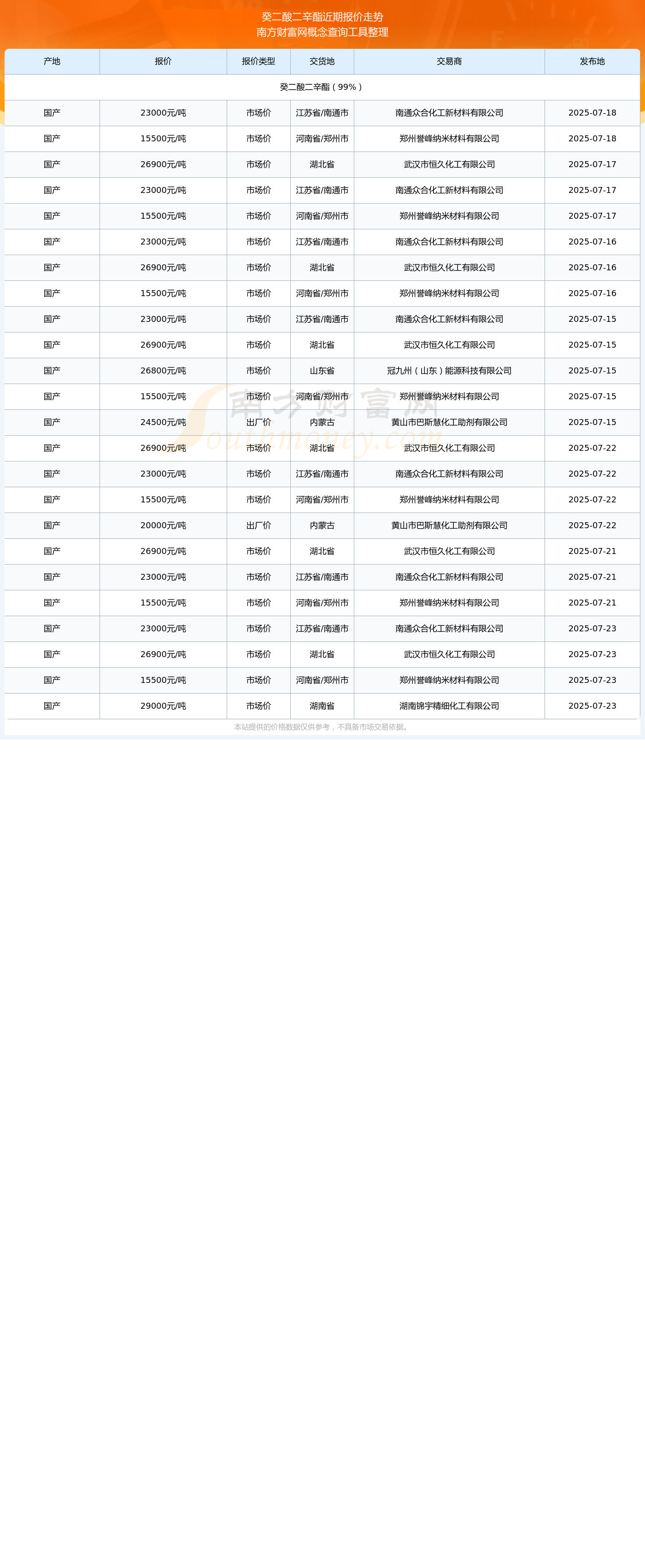 2025年7月23日,南通众合化工新材料有限公司癸二酸二辛酯(99%),国产,交易地点为江苏省/南通市,报价为23000.00元/吨。