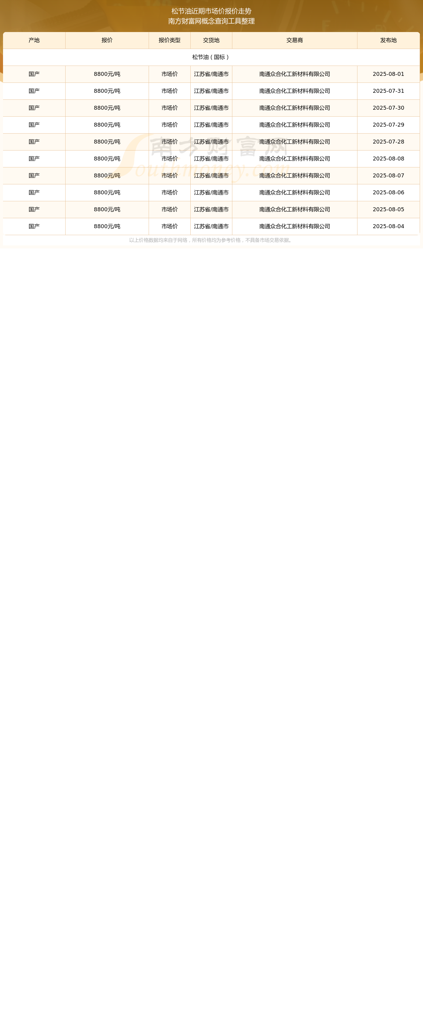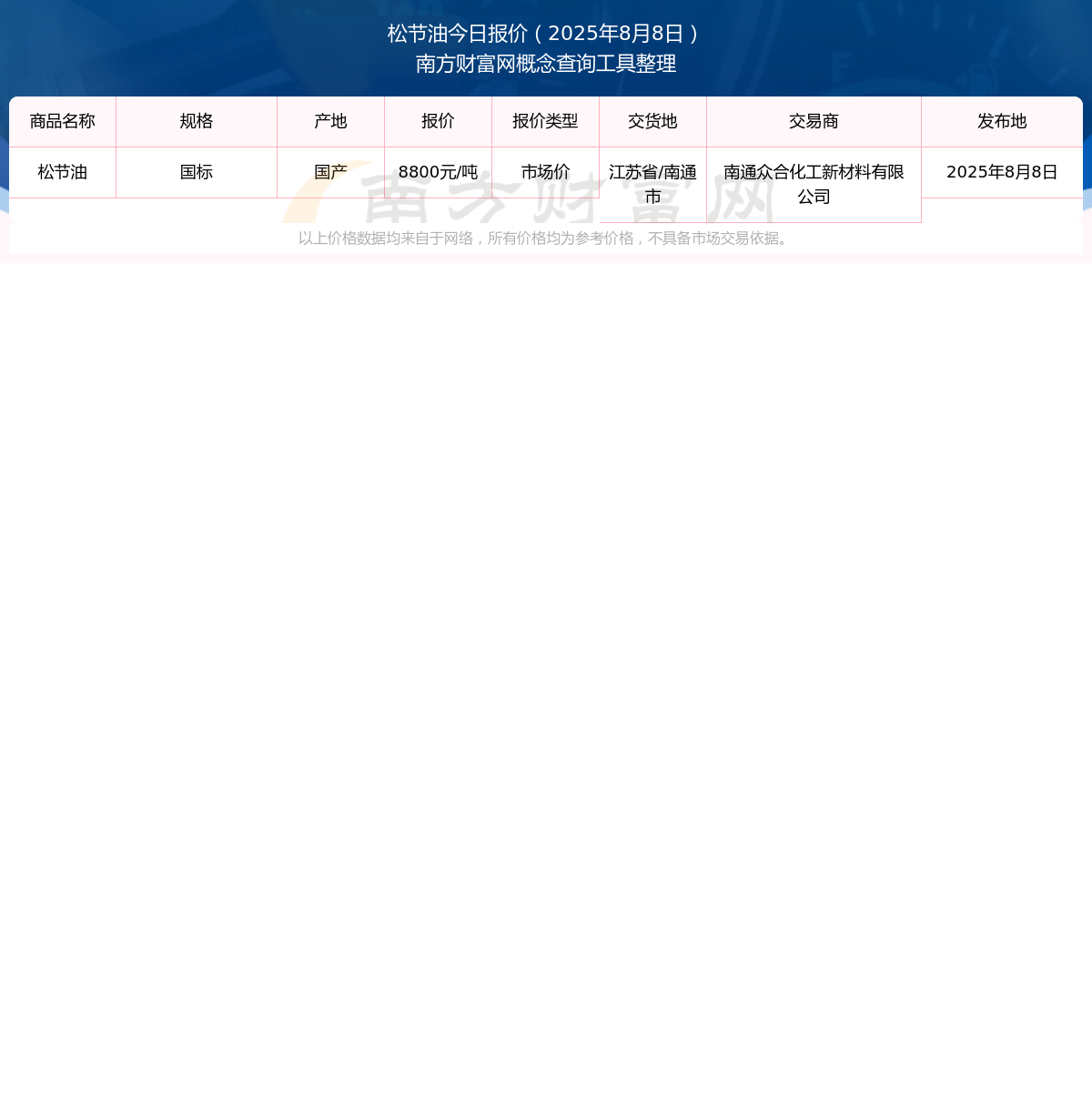 2025年8月8日,南通众合化工新材料有限公司松节油(国标),国产,交易地点为江苏省/南通市,市场价报价为8800.00元/吨。