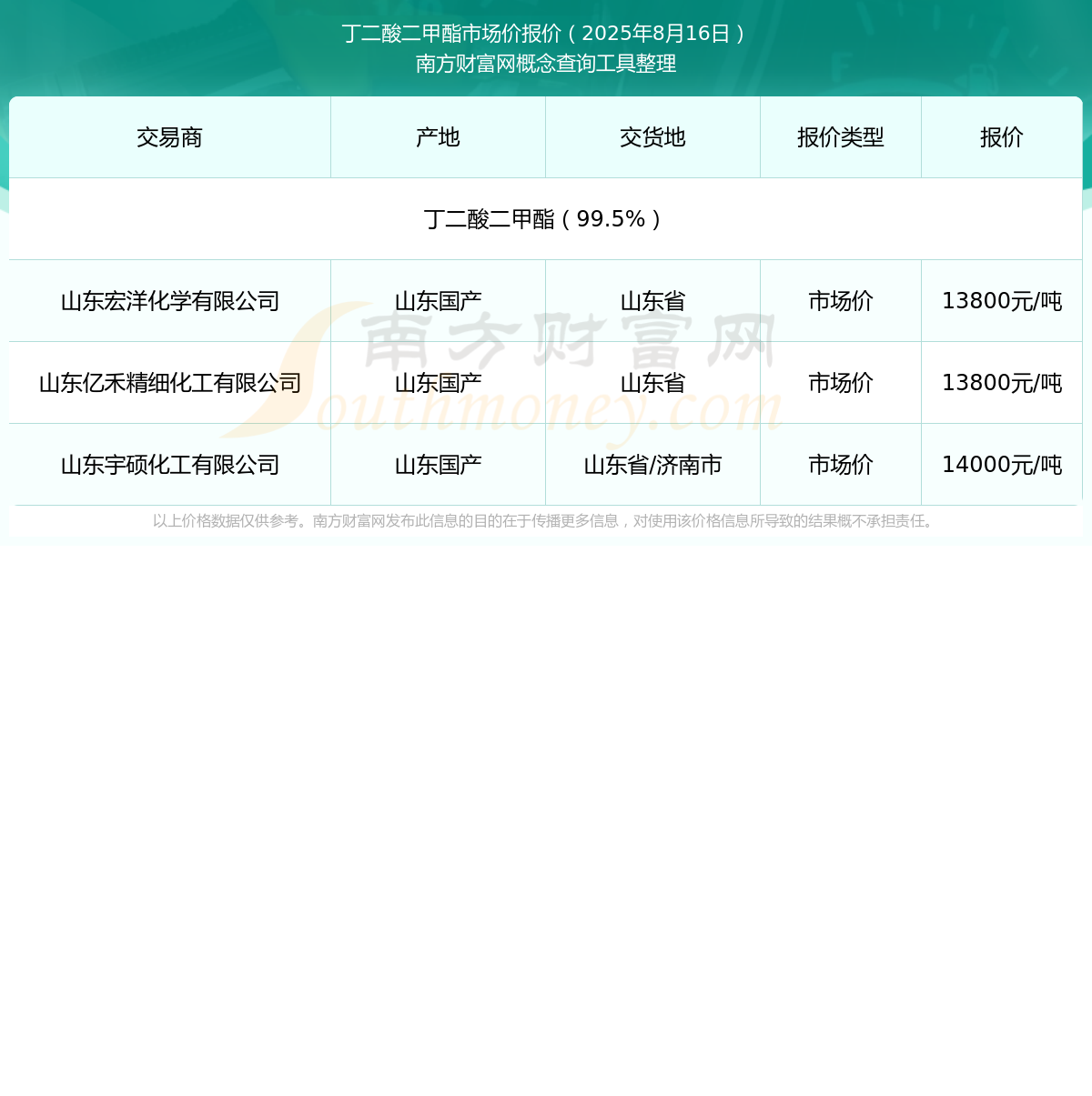 2025年8月16日,山东亿禾精细化工有限公司丁二酸二甲酯(99.5%),山东国产,交易地点为山东省,市场价报价为13800.00元/吨。