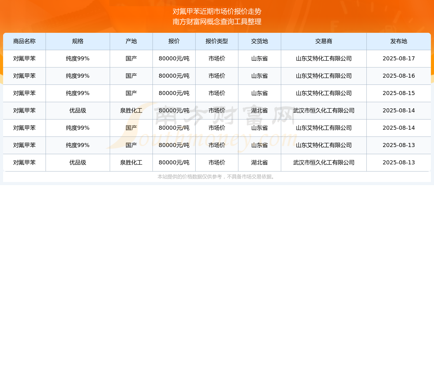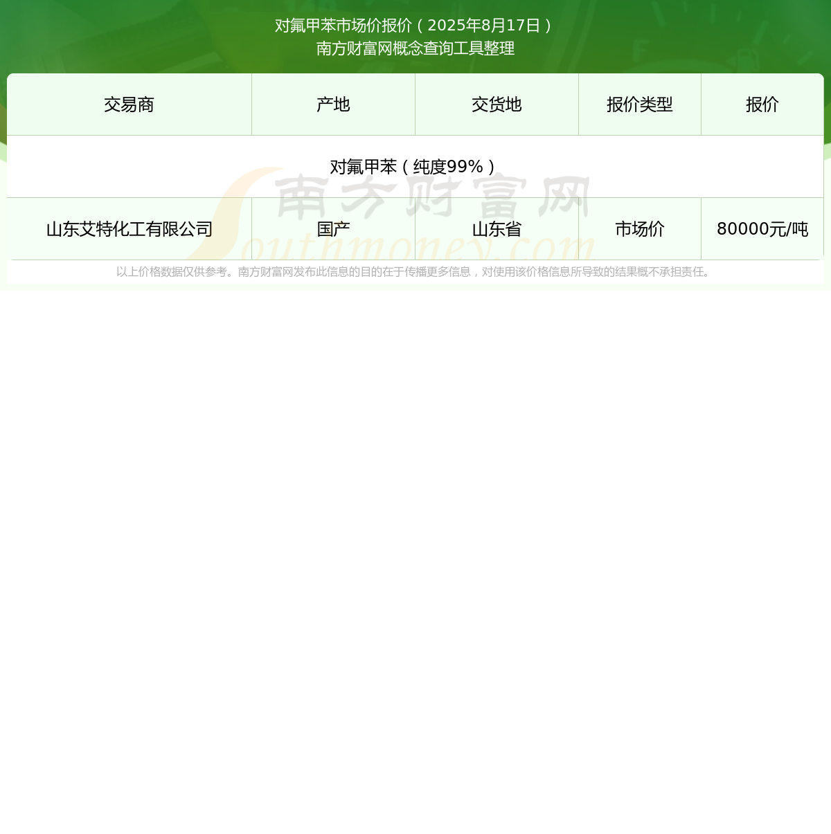 2025年8月17日,对氟甲苯(纯度99%)市场价价格为80000.00元/吨,报价人:山东艾特化工有限公司,交易地点为山东省。