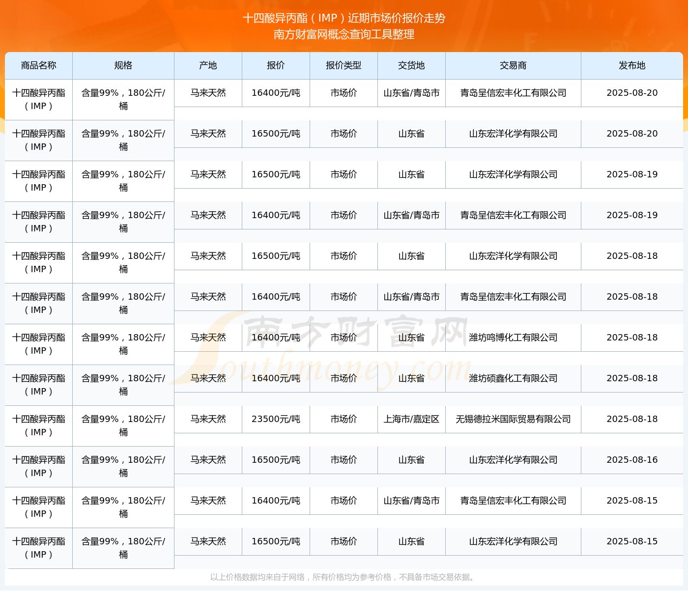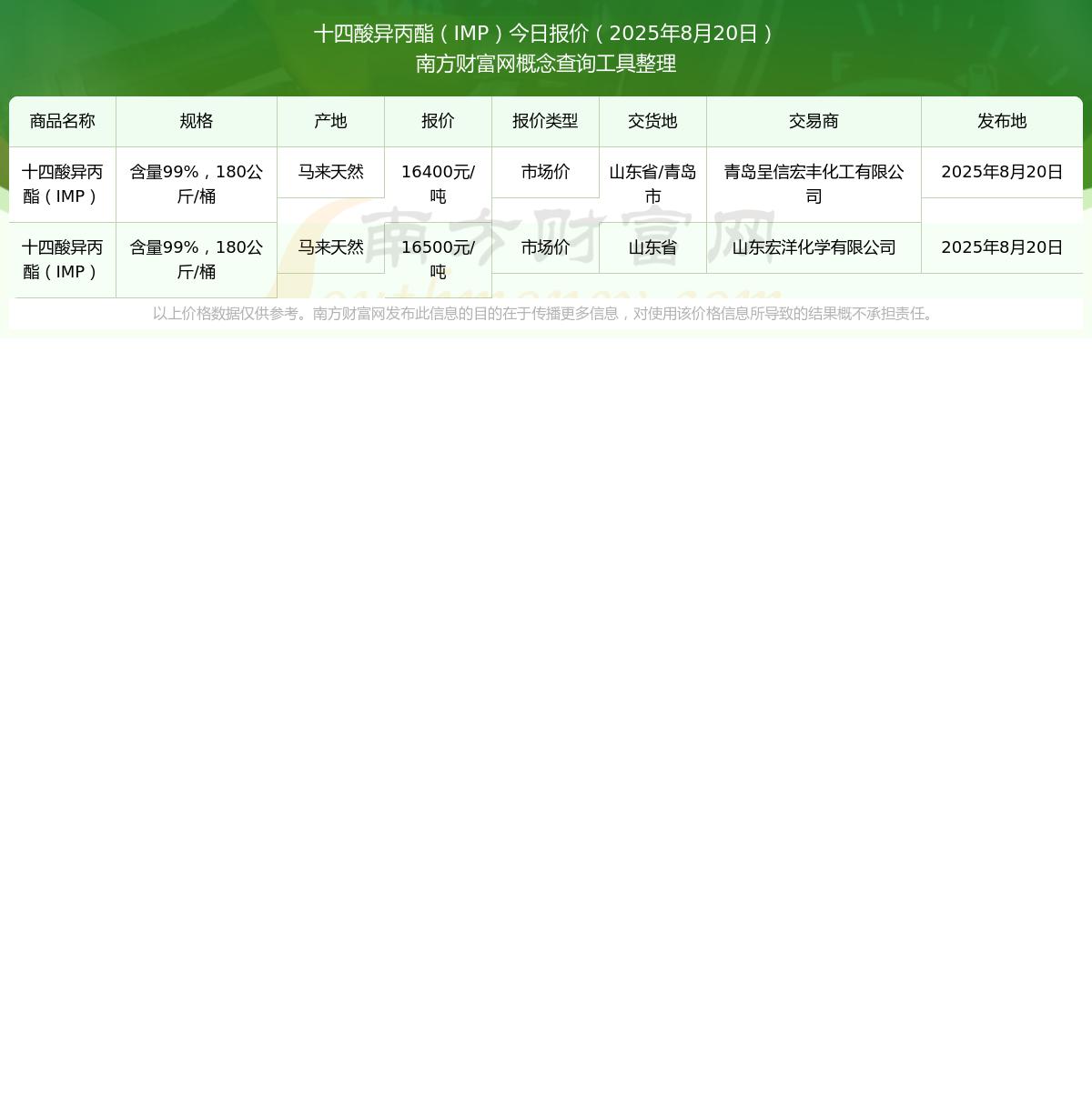 2025年8月20日,山东宏洋化学有限公司十四酸异丙酯(IMP)(含量99%,180公斤/桶),马来天然,交易地点为山东省,市场价报价为16500.00元/吨。
