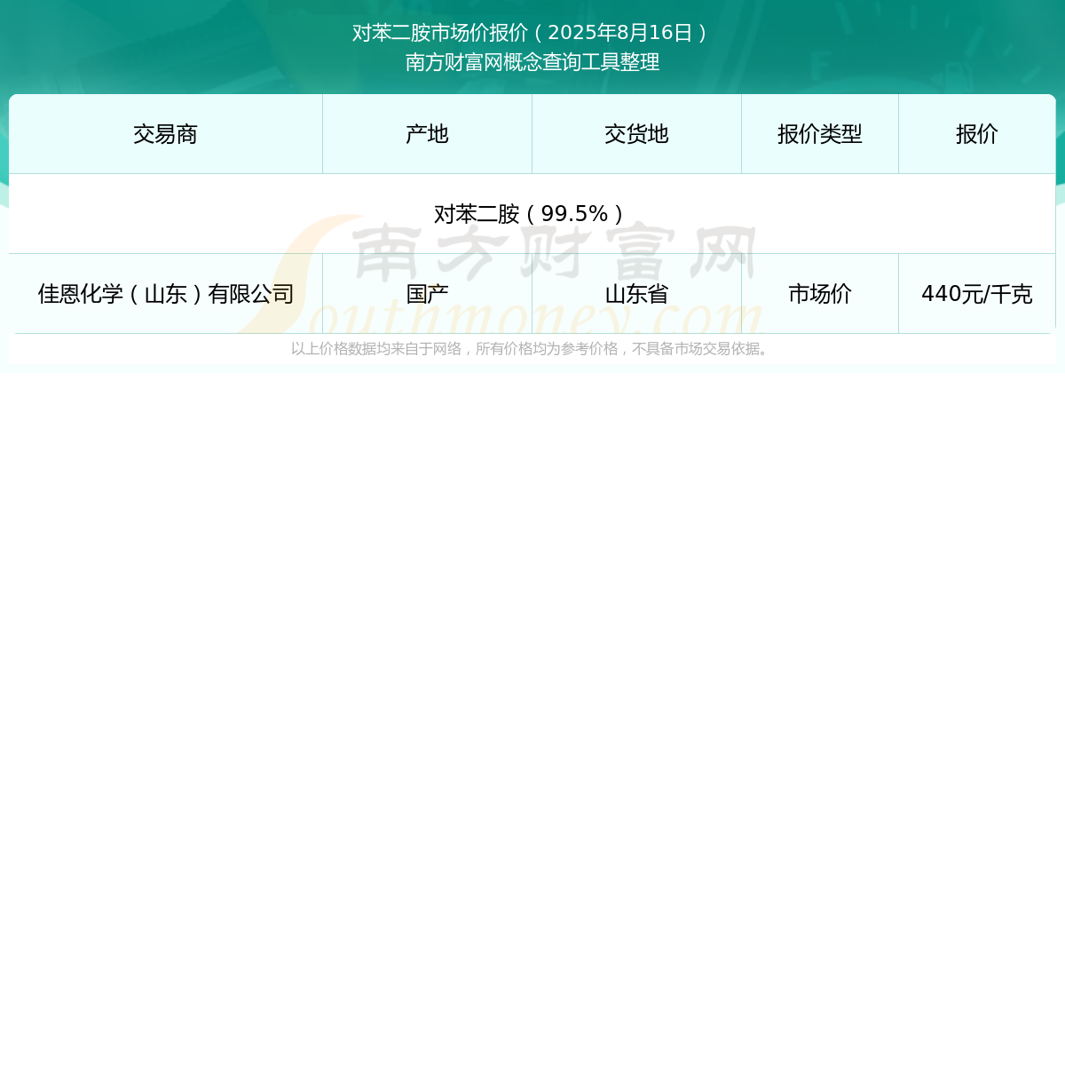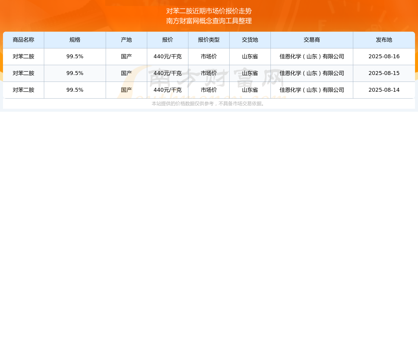 2025年8月16日,佳恩化学(山东)有限公司对苯二胺(99.5%),国产,交易地点为山东省,市场价报价为440.00元/千克。