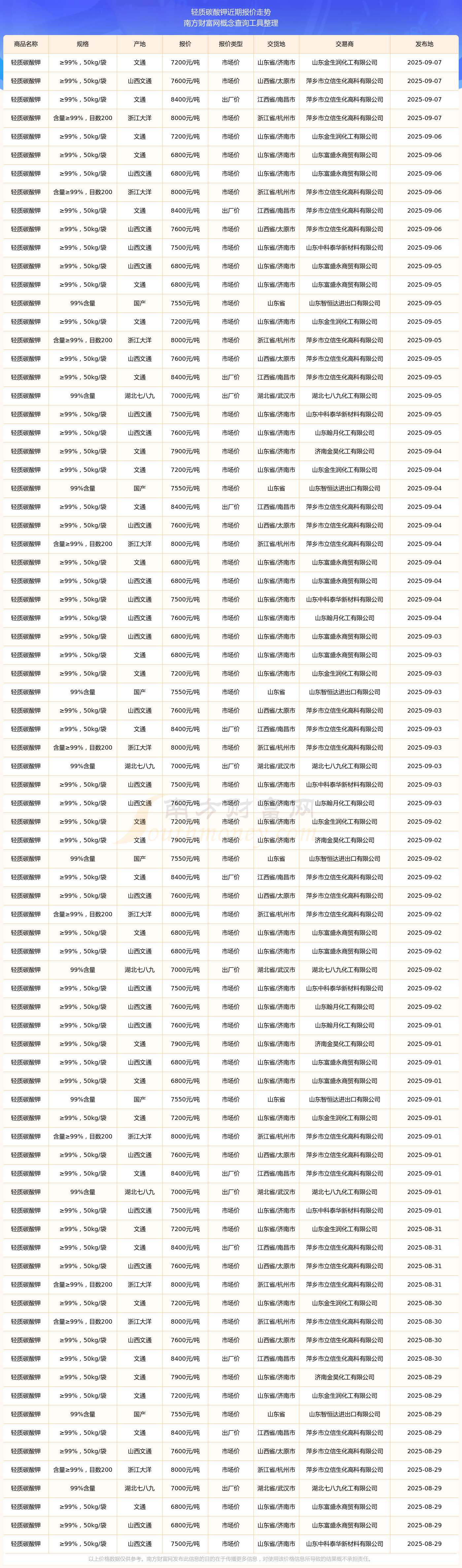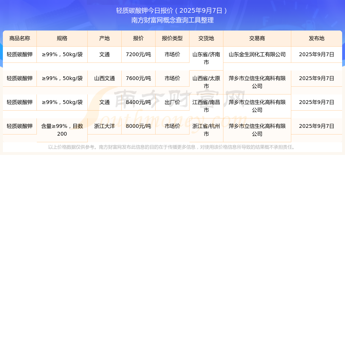 2025年9月7日,山东金生润化工有限公司轻质碳酸钾(≥99%,50kg/袋),文通,交易地点为山东省/济南市,报价为7200.00元/吨。
