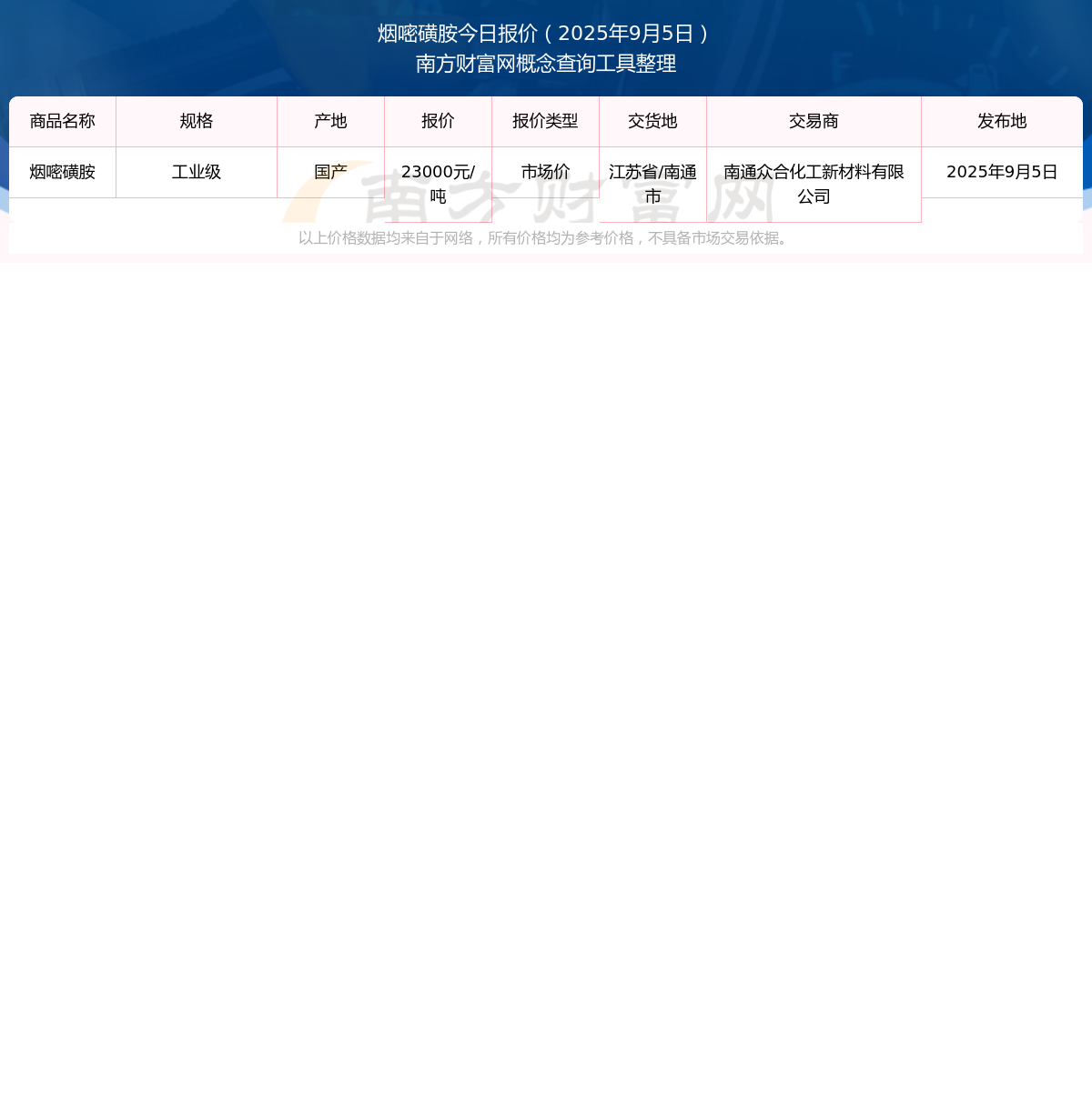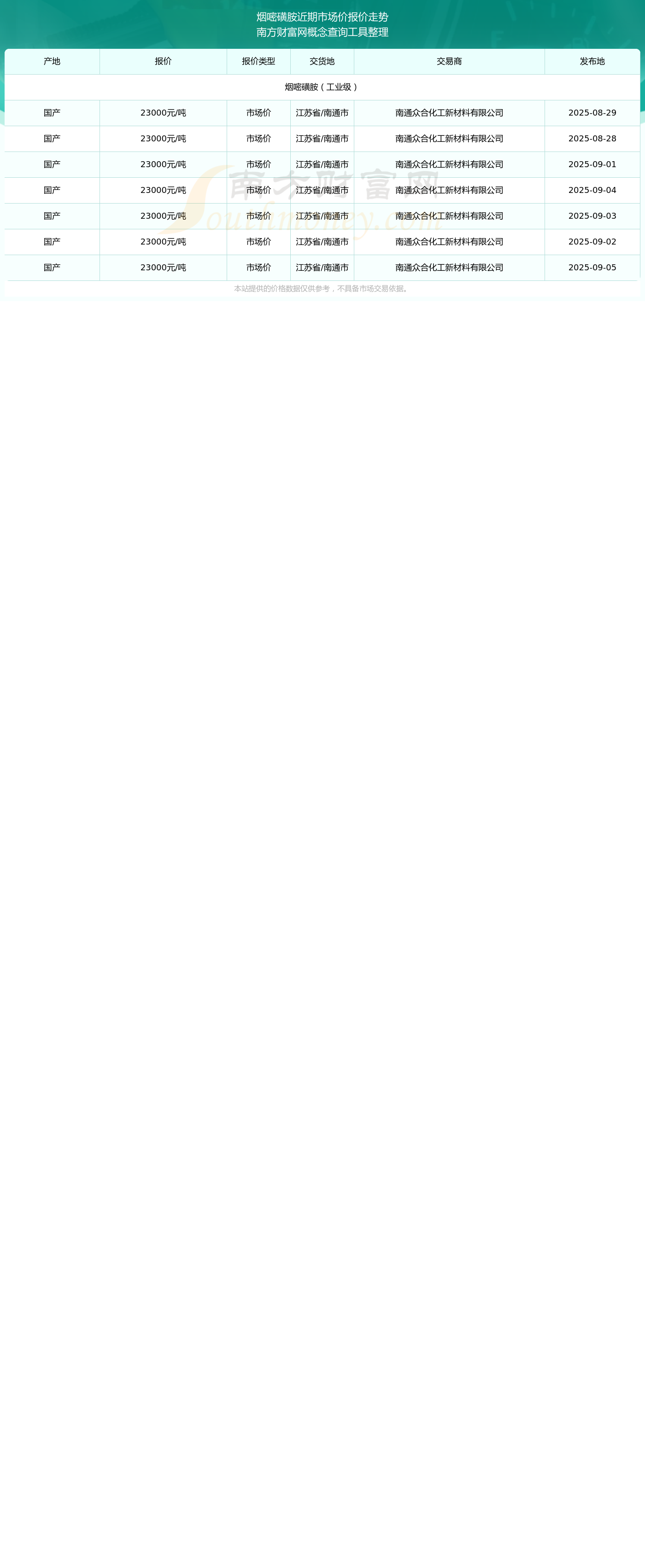 2025年9月5日,南通众合化工新材料有限公司烟嘧磺胺(工业级),国产,交易地点为江苏省/南通市,市场价报价为23000.00元/吨。
