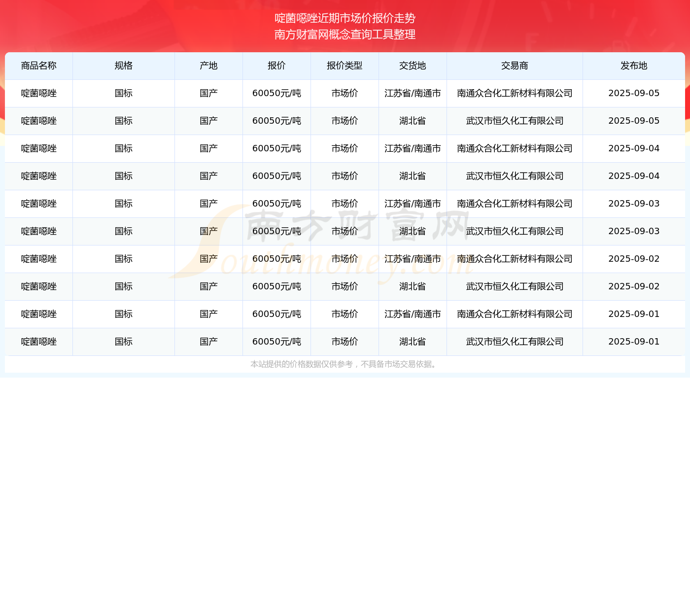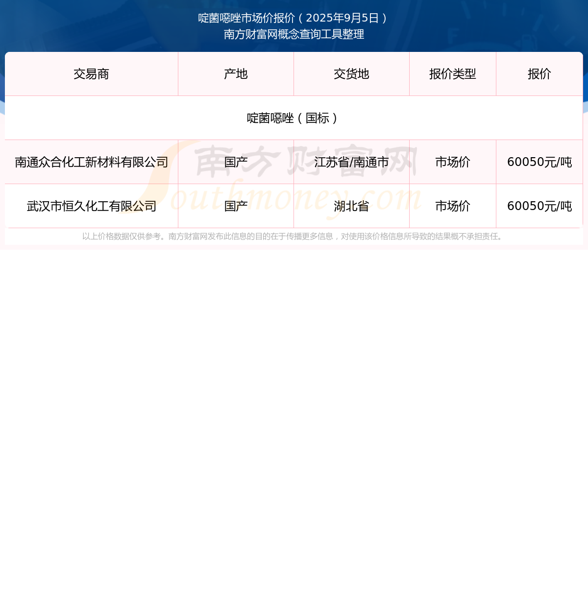 2025年9月5日,南通众合化工新材料有限公司啶菌噁唑(国标),国产,交易地点为江苏省/南通市,市场价报价为60050.00元/吨。