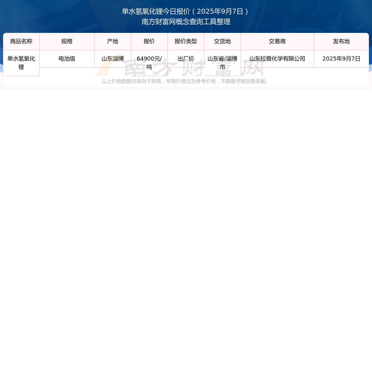 2025年9月7日,单水氢氧化锂(电池级)价格为64900.00元/吨,报价人:山东拉雅化学有限公司,交易地点为山东省/淄博市。