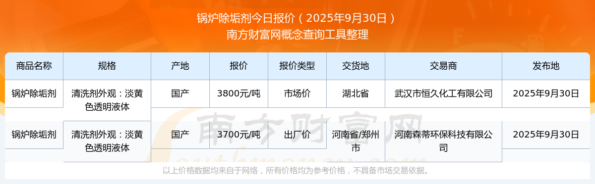 2025年9月30日锅炉除垢剂报价多少_近期价格走势