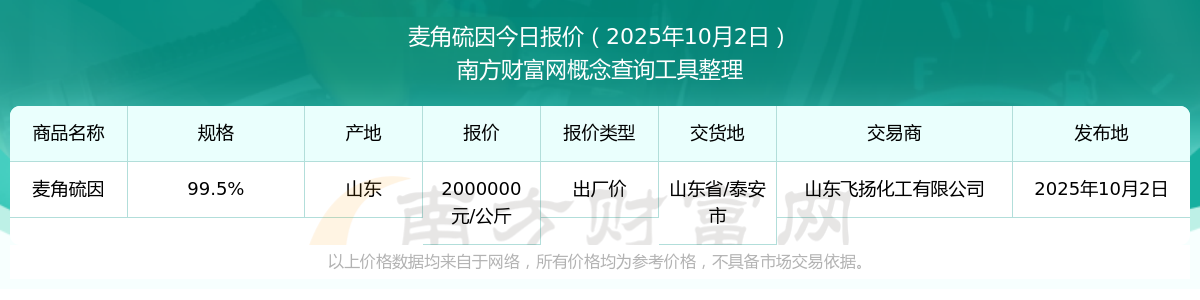 2025年10月2日,麦角硫因(99.5%)出厂价价格为2000000.00元/公斤,报价人:山东飞扬化工有限公司,交易地点为山东省/泰安市。