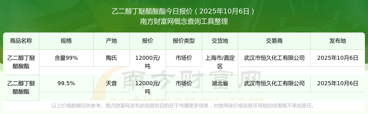 2025年10月6日,乙二醇丁醚醋酸酯(99.5%)价格为12000.00元/吨,报价人:武汉市恒久化工有限公司,交易地点为湖北省。
