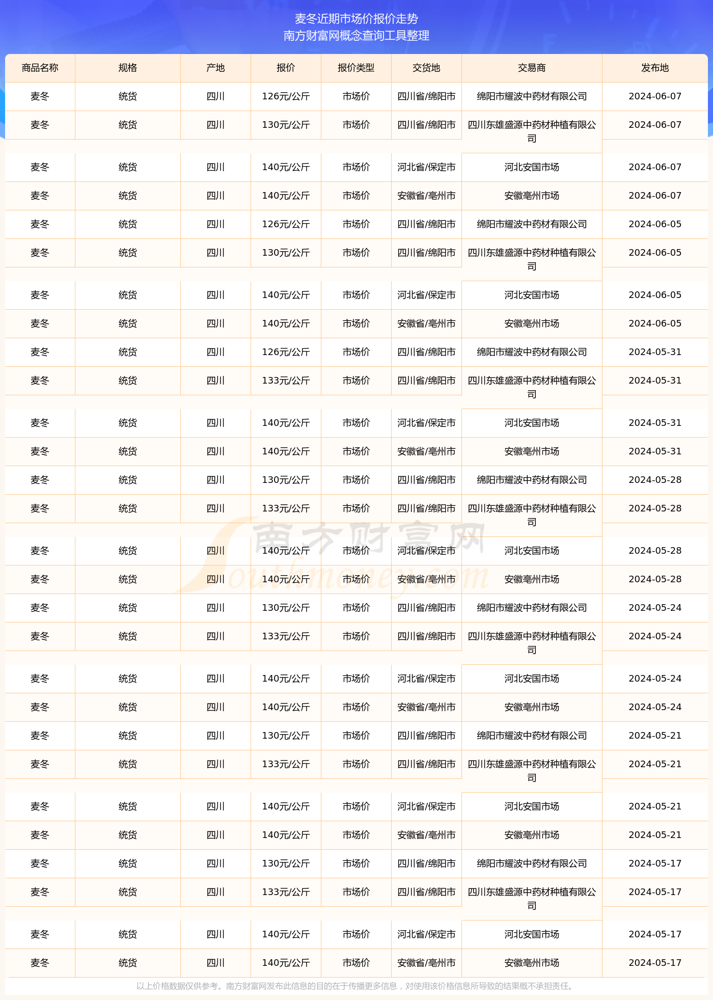 2024年6月7日,麦冬(统货)市场价价格为130.00元/公斤,报价人:四川东雄盛源中药材种植有限公司,交易地点为四川省/绵阳市。