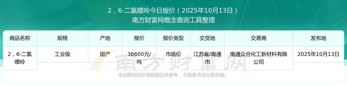 2025年10月13日,南通众合化工新材料有限公司2,6-二氯嘌呤(工业级),国产,交易地点为江苏省/南通市,市场价报价为36600.00元/吨。