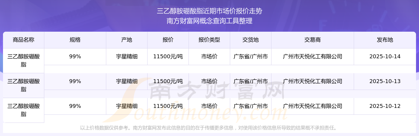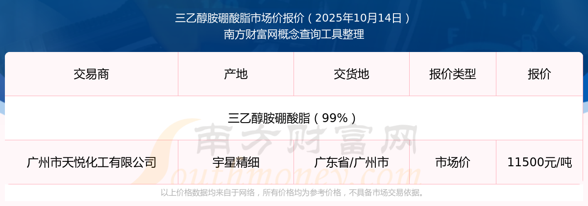 2025年10月14日,三乙醇胺硼酸脂(99%)市场价价格为11500.00元/吨,报价人:广州市天悦化工有限公司,交易地点为广东省/广州市。