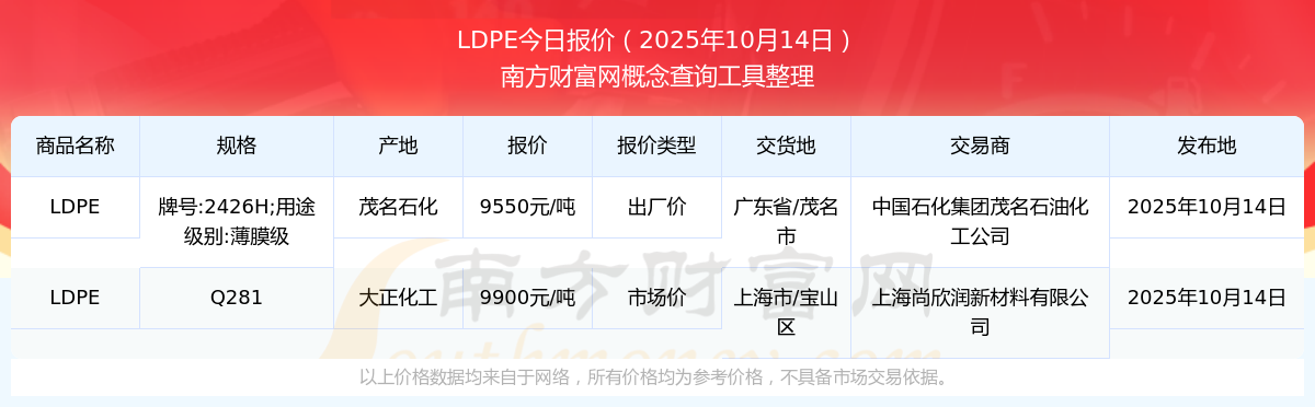 2025年10月14日,LDPE(牌号:2426H;用途级别:薄膜级)价格为9550.00元/吨,报价人:中国石化集团茂名石油化工公司,交易地点为广东省/茂名市。