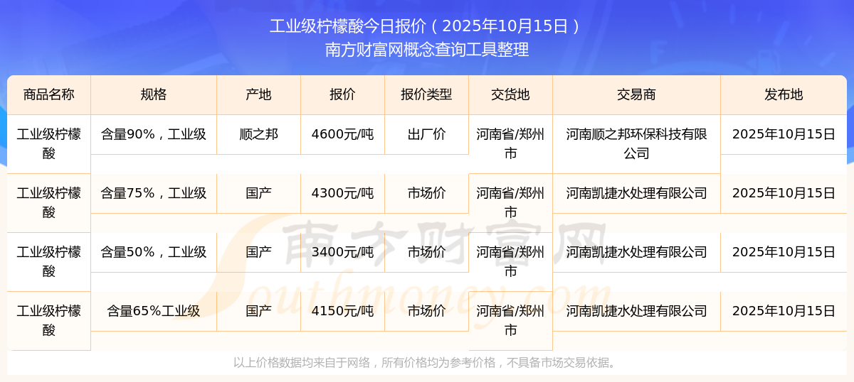 2025年10月15日,河南凯捷水处理有限公司工业级柠檬酸(含量50%,工业级),国产,交易地点为河南省/郑州市,报价为3400.00元/吨。