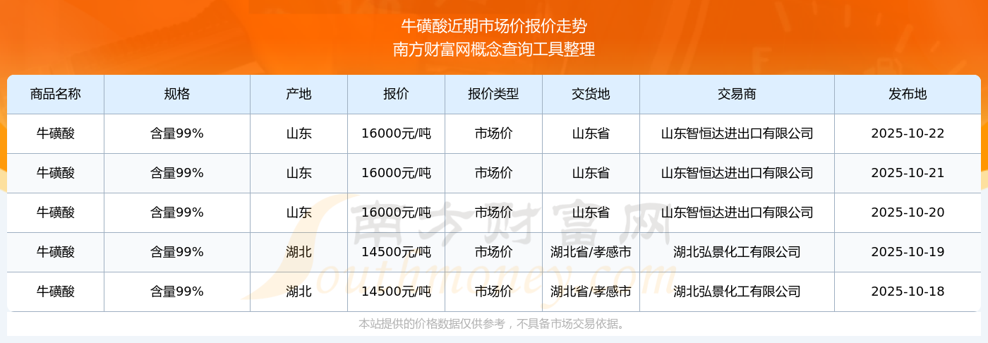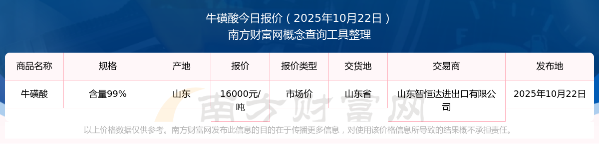 2025年10月22日,山东智恒达进出口有限公司牛磺酸(含量99%),山东,交易地点为山东省,市场价报价为16000.00元/吨。