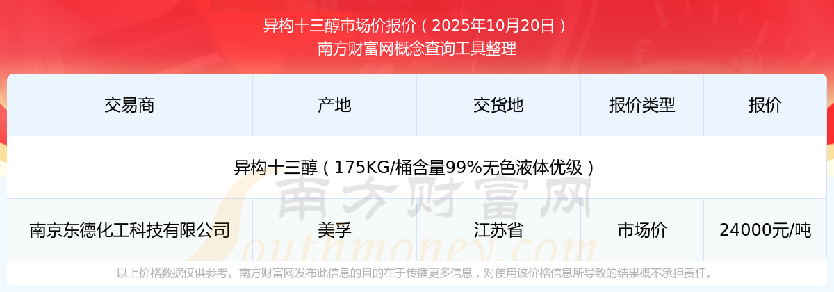 2025年10月20日,南京东德化工科技有限公司异构十三醇(175KG/桶含量99%无色液体优级),美孚,交易地点为江苏省,市场价报价为24000.00元/吨。