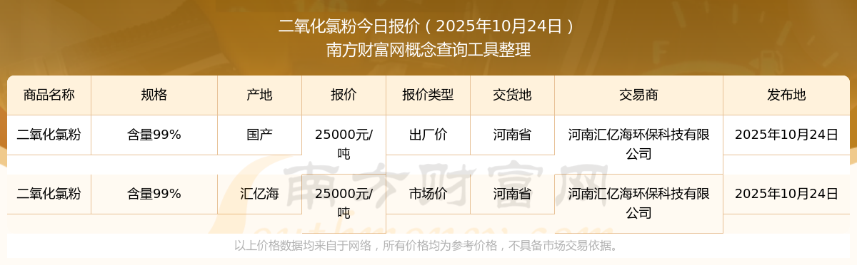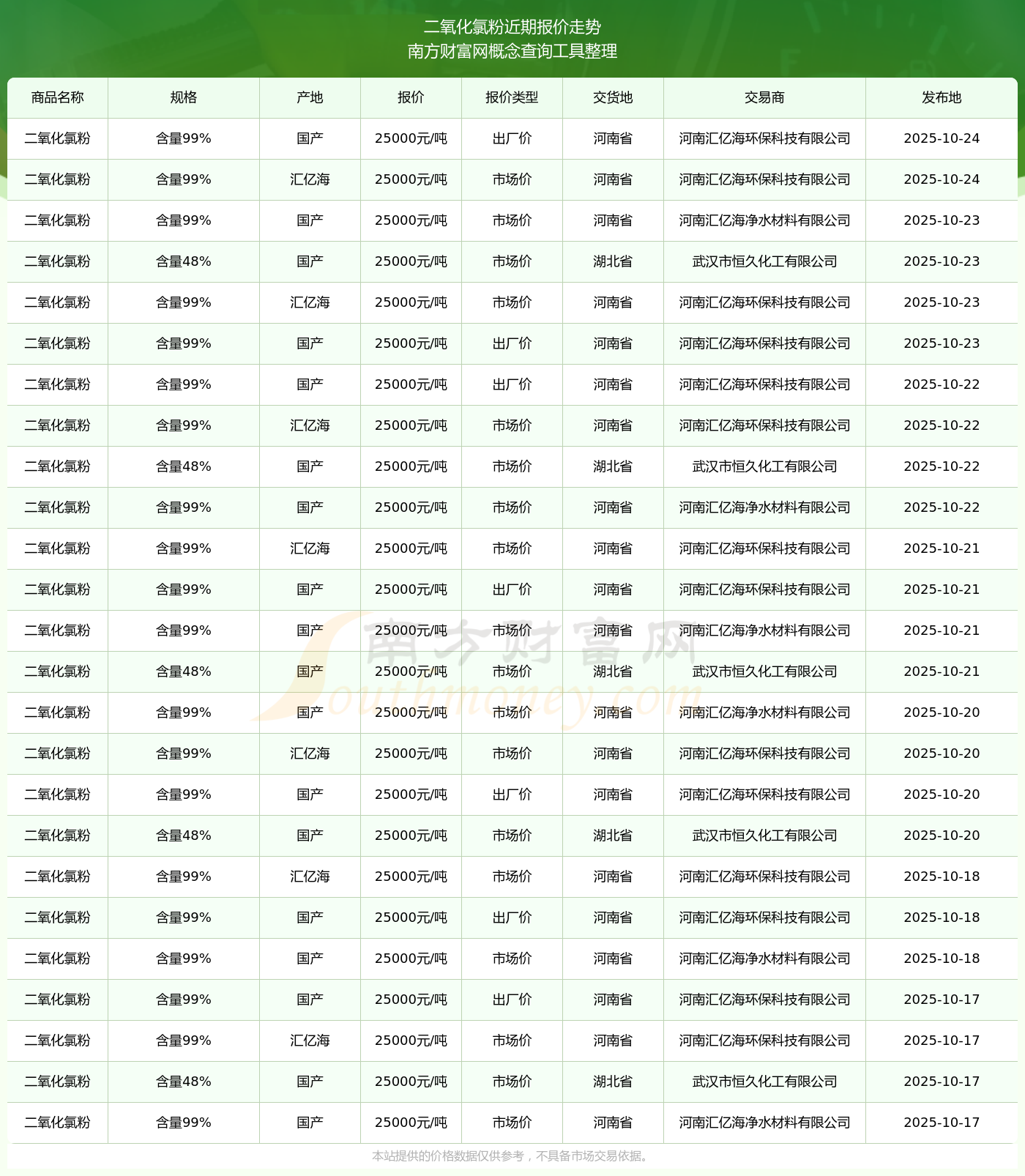 2025年10月24日,河南汇亿海环保科技有限公司二氧化氯粉(含量99%),国产,交易地点为河南省,报价为25000.00元/吨。