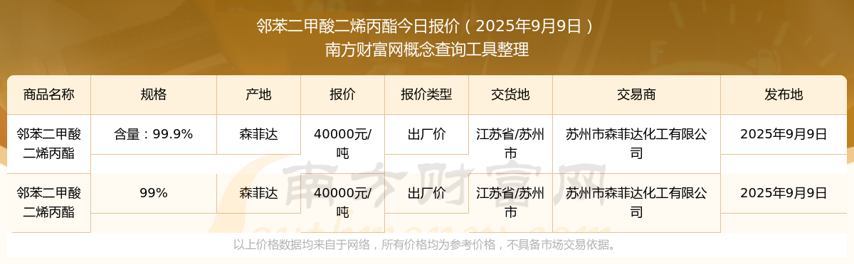 2025年9月9日,苏州市森菲达化工有限公司邻苯二甲酸二烯丙酯(99%),森菲达,交易地点为江苏省/苏州市,出厂价报价为40000.00元/吨。