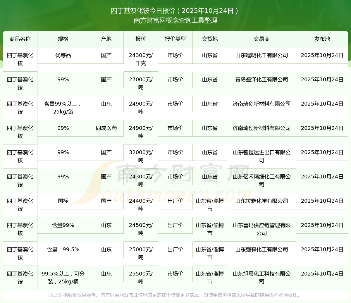 2025年10月24日,济南琦创新材料有限公司四丁基溴化铵(含量99%以上,25kg/袋),山东,交易地点为山东省,报价为24900.00元/吨。