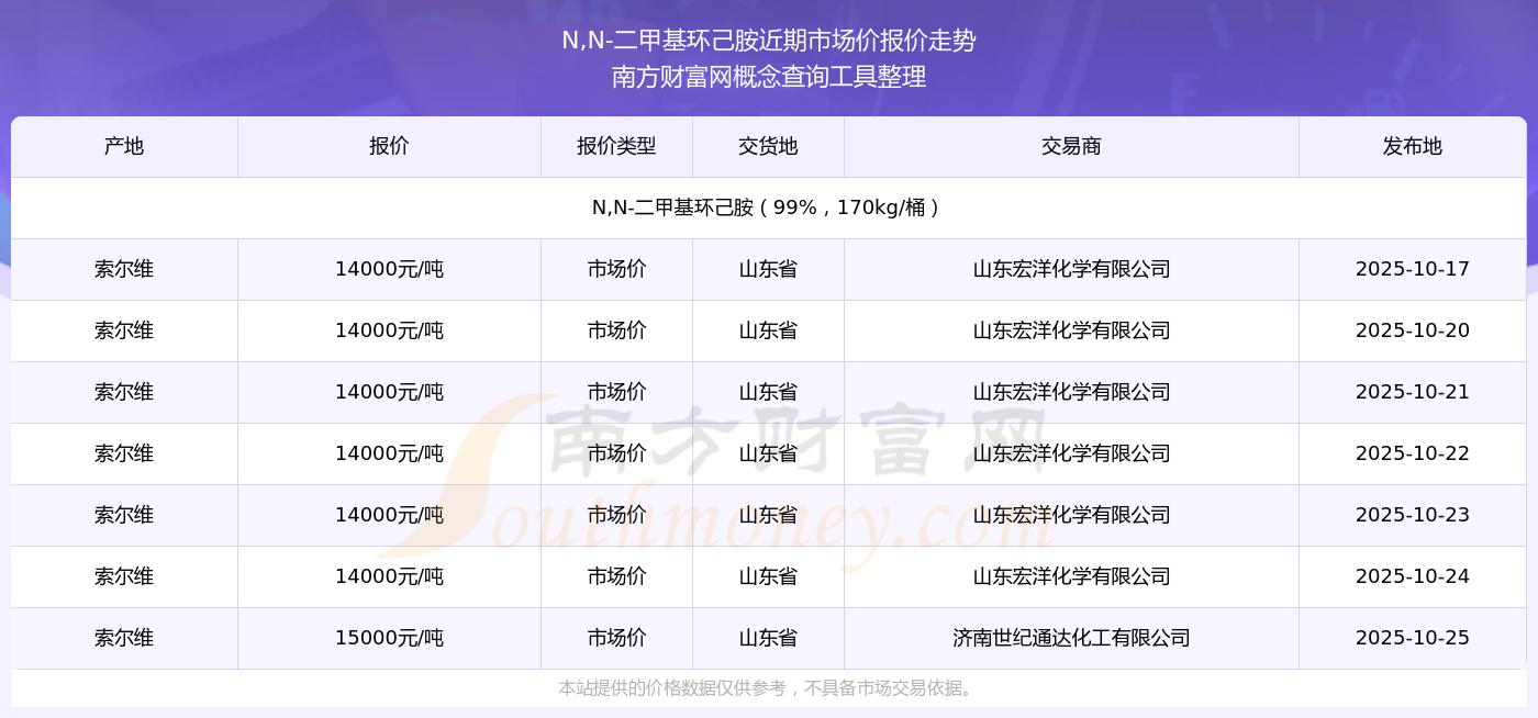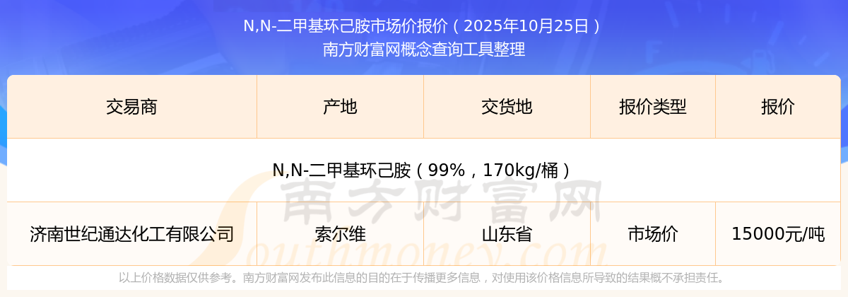 2025年10月25日,济南世纪通达化工有限公司N,N-二甲基环己胺(99%,170kg/桶),索尔维,交易地点为山东省,市场价报价为15000.00元/吨。