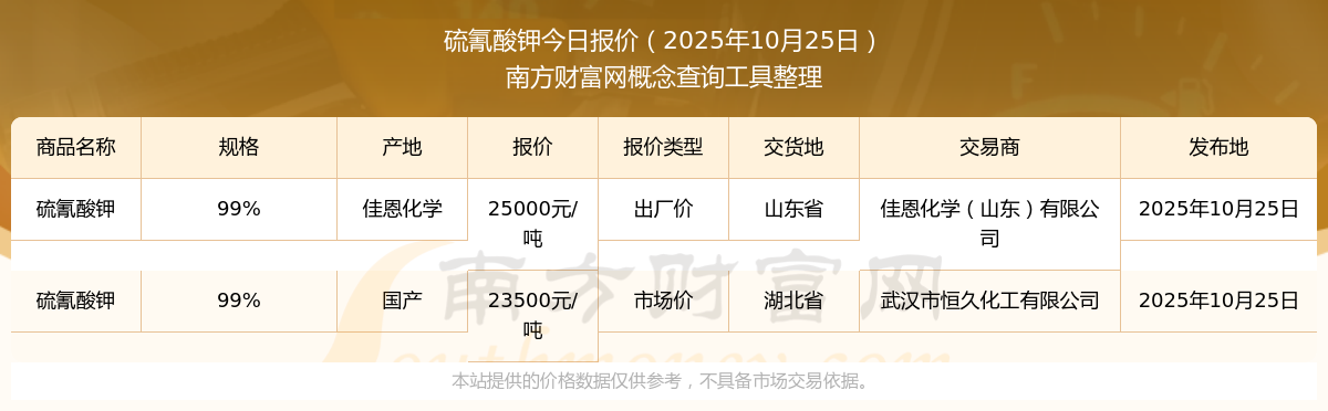 2025年10月25日,武汉市恒久化工有限公司硫氰酸钾(99%),国产,交易地点为湖北省,报价为23500.00元/吨。