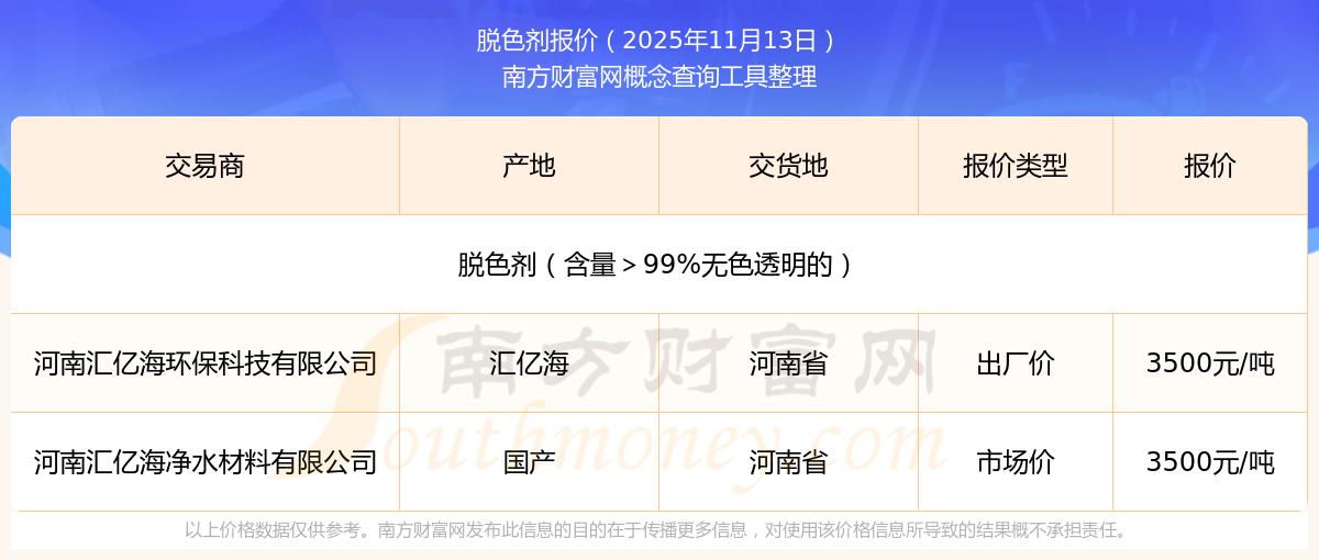 2025年11月13日,脱色剂(含量>99%无色透明的)价格为3500.00元/吨,报价人:河南汇亿海环保科技有限公司,交易地点为河南省。