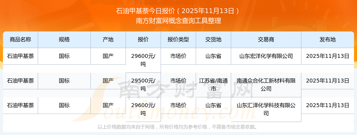 2025年11月13日,石油甲基萘(国标)市场价价格为29500.00元/吨,报价人:南通众合化工新材料有限公司,交易地点为江苏省/南通市。