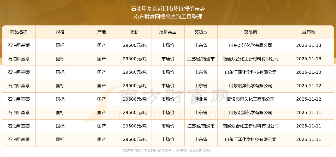 2025年11月13日,石油甲基萘(国标)市场价价格为29600.00元/吨,报价人:山东宏洋化学有限公司,交易地点为山东省。