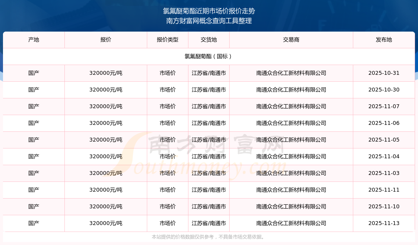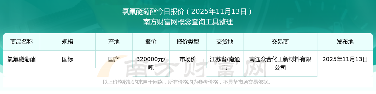 2025年11月13日,氯氟醚菊酯(国标)市场价价格为320000.00元/吨,报价人:南通众合化工新材料有限公司,交易地点为江苏省/南通市。