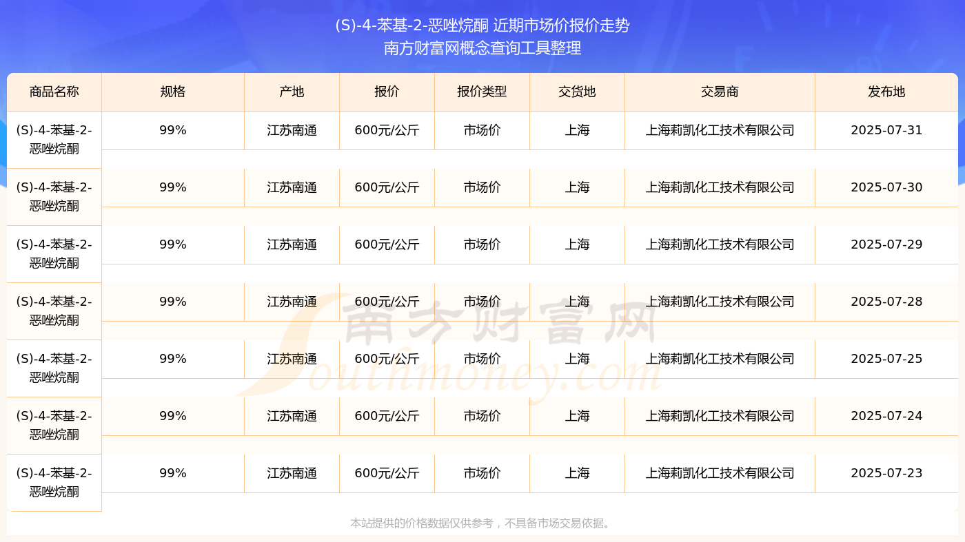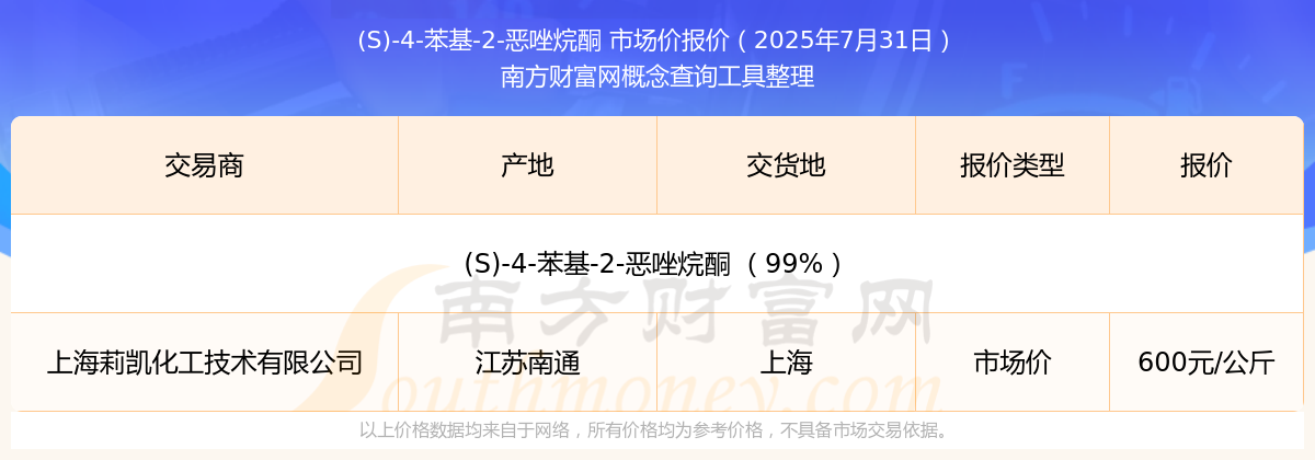 2025年7月31日,(S)-4-苯基-2-恶唑烷酮 (99%)市场价价格为600.00元/公斤,报价人:上海莉凯化工技术有限公司,交易地点为上海。