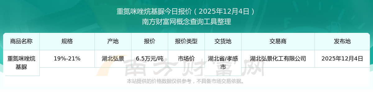 2025年12月4日,重氮咪唑烷基脲(19%-21%)市场价价格为6.50万元/吨,报价人:湖北弘景化工有限公司,交易地点为湖北省/孝感市。
