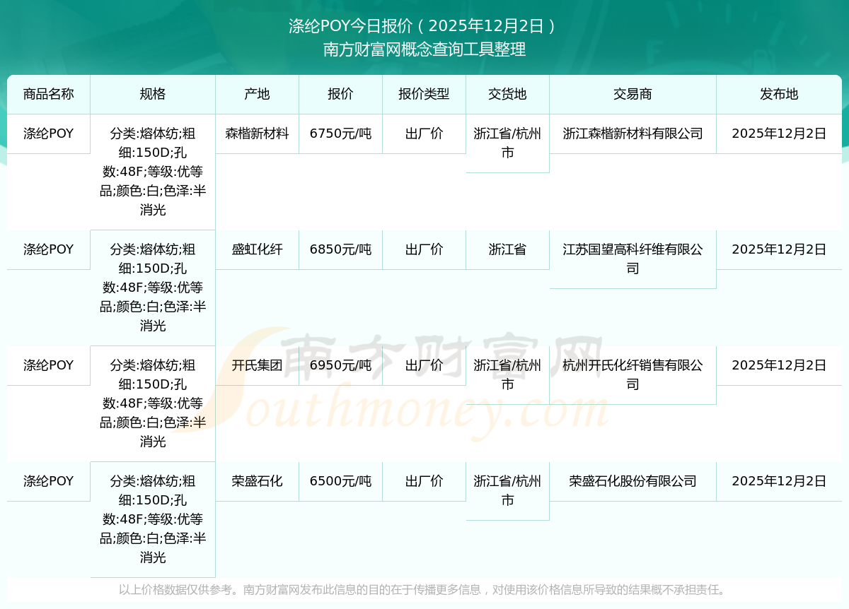 2025年12月2日,浙江森楷新材料有限公司涤纶POY(分类:熔体纺;粗细:150D;孔数:48F;等级:优等品;颜色:白;色泽:半消光),森楷新材料,交易地点为浙江省/杭州市,出厂价报价为6750.00元/吨。