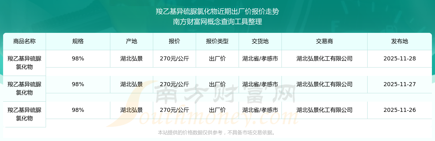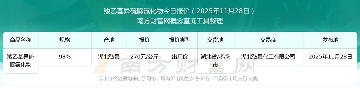2025年11月28日,湖北弘景化工有限公司羧乙基异硫脲氯化物(98%),湖北弘景,交易地点为湖北省/孝感市,出厂价报价为270.00元/公斤。