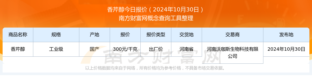 2024年10月30日,河南沃咖斯生物科技有限公司香芹醇(工业级),国产,交易地点为河南省,出厂价报价为300.00元/千克。