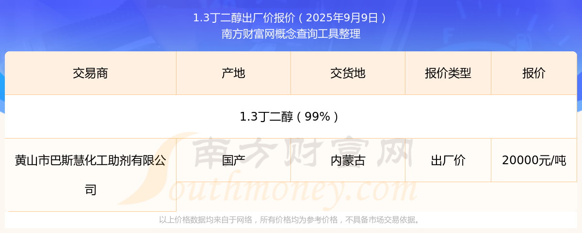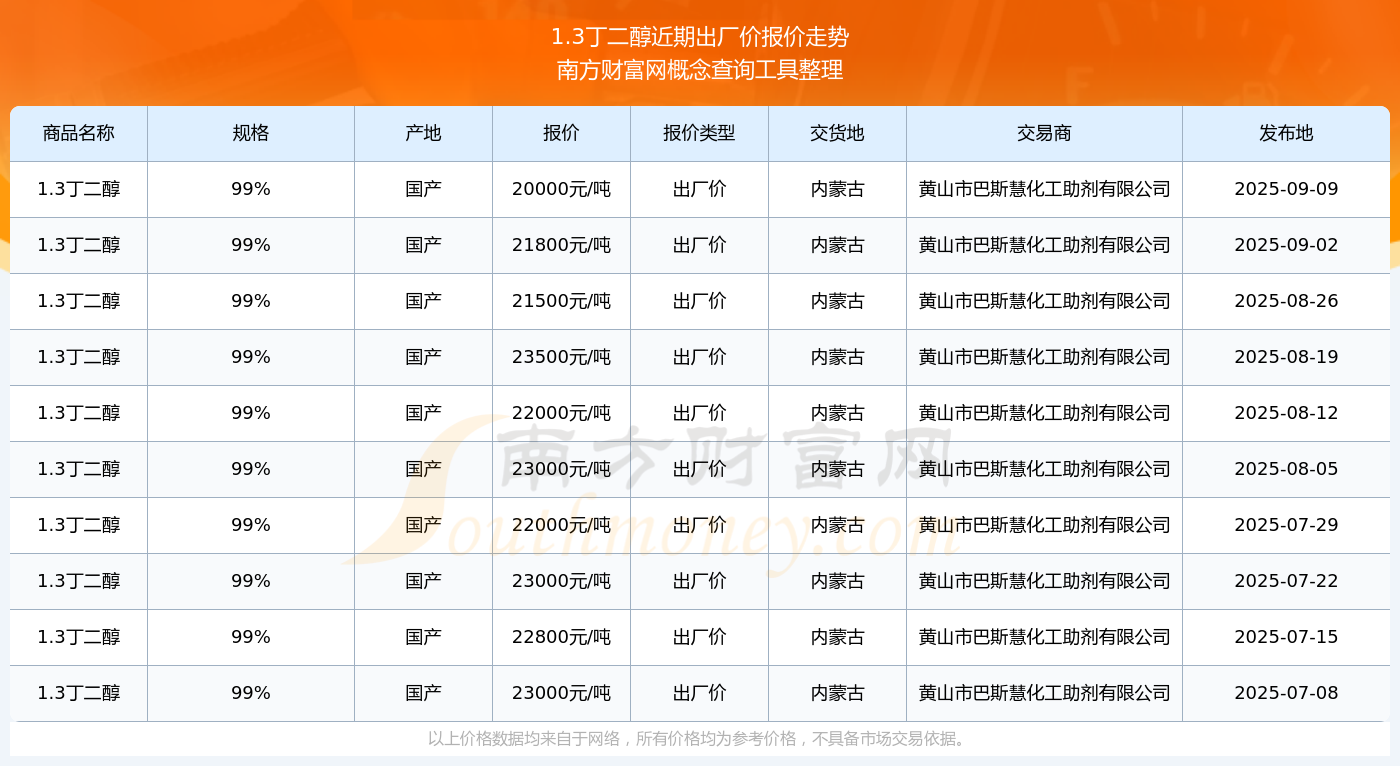 2025年9月9日,黄山市巴斯慧化工助剂有限公司1.3丁二醇(99%),国产,交易地点为内蒙古,出厂价报价为20000.00元/吨。