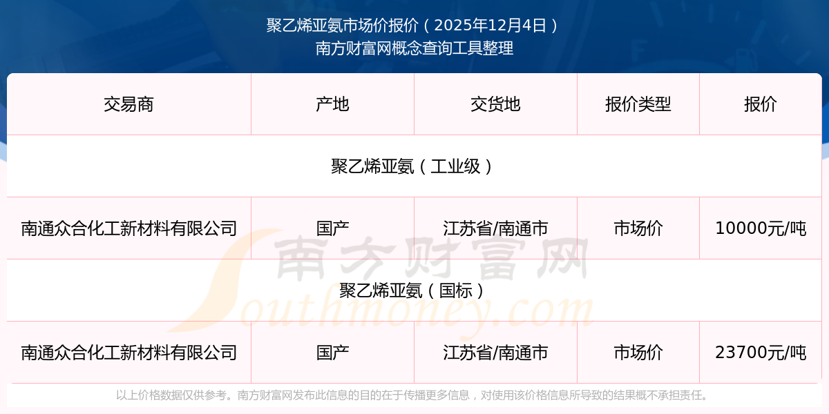 2025年12月4日,南通众合化工新材料有限公司聚乙烯亚氨(工业级),国产,交易地点为江苏省/南通市,市场价报价为10000.00元/吨。