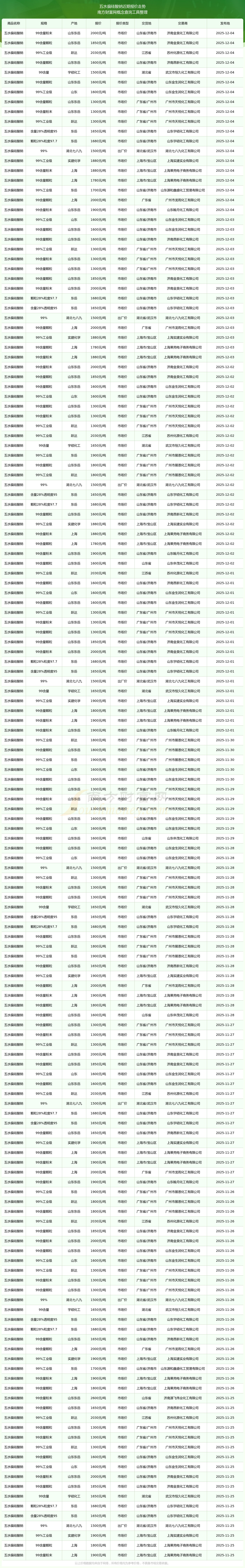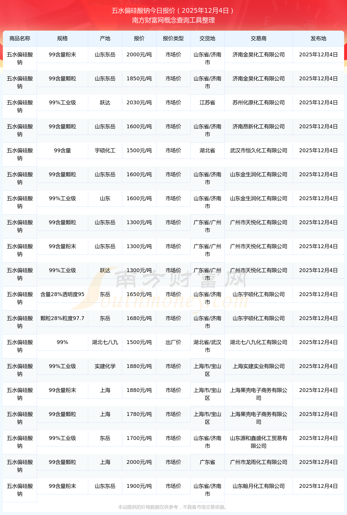 2025年12月4日,济南金昊化工有限公司五水偏硅酸钠(99含量粉末),山东东岳,交易地点为山东省/济南市,报价为2000.00元/吨。