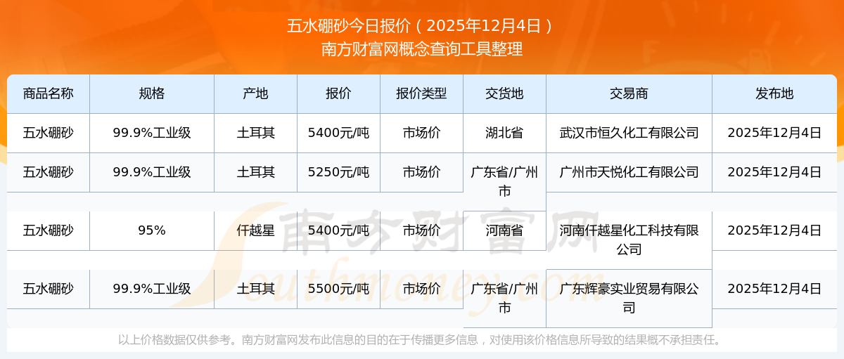 2025年12月4日,武汉市恒久化工有限公司五水硼砂(99.9%工业级),土耳其,交易地点为湖北省,市场价报价为5400.00元/吨。